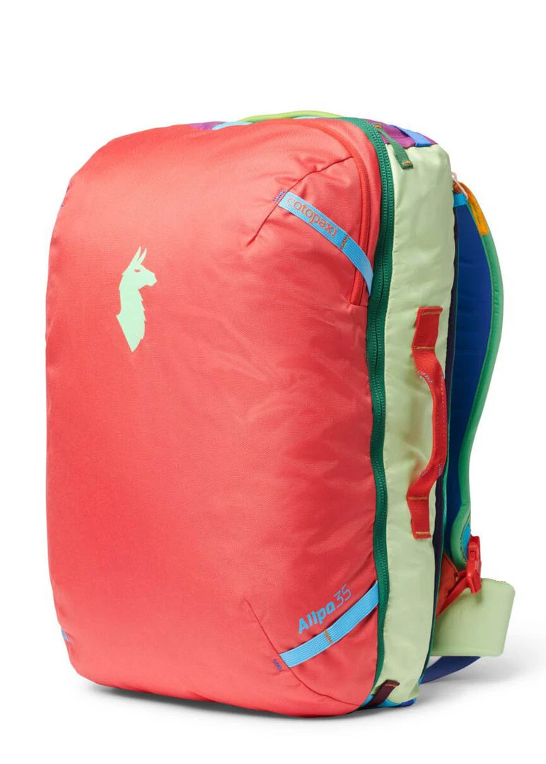 Cotopaxi Del Dia Allpa Travel Pack is an rugged 35L travel bag and part of Cotopaxi’s signature adventure travel pack. The Allpa 35L Travel Pack protects and comfortably carries all your possessions, with a slightly smaller size than the 42 perfect for a few days away, whether you’re headed across the ocean, across state lines, or across the street.