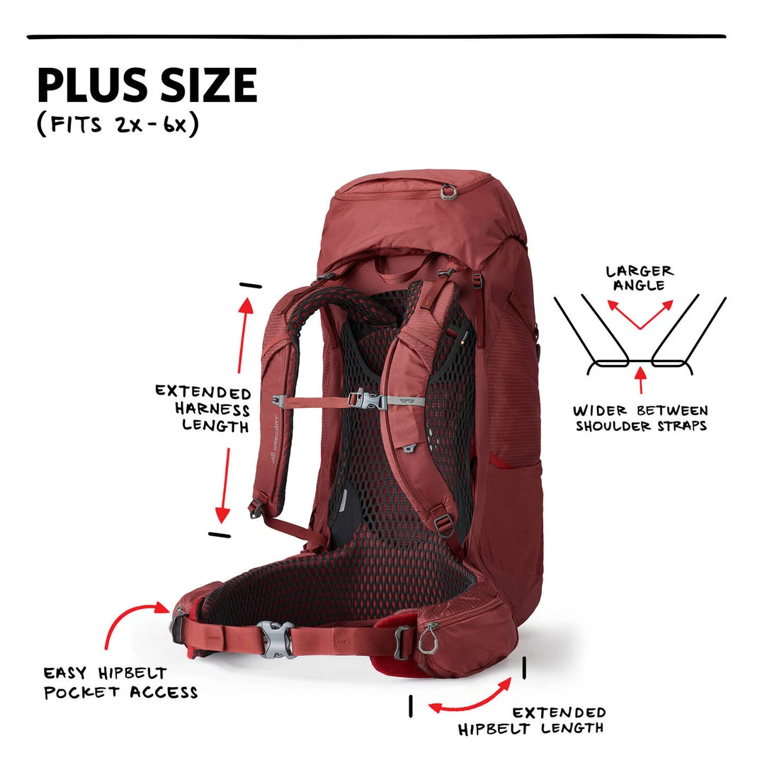 Melody is 5’4″ and typically wears a size 2X in apparel. She has a 16″ torso and is shown wearing an S/M torso Kalmia. Plus Size packs are designed with extended-length shoulder straps and hip belts, plus additional fit revisions to accommodate larger body shapes and sizes.