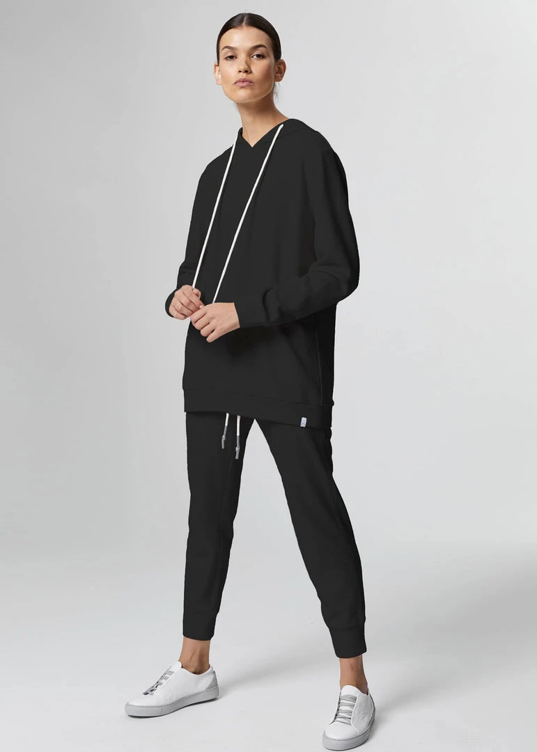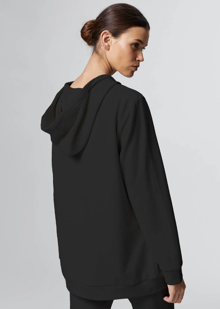 Varley Fink Sweater is the perfect oversized hoodie. Some days call for the comfort only an oversized hoodie and leggings can provide. The Fink Sweatshirt from Varley knows what you need and is here for you time and time again. This longline hooded sweatshirt features extra-long wax-dipped drawcords adding a touch of interest. The color is not a true black but instead has a more broken-in-washed feel to the fabric. We love it with a pair of bike shorts and sneakers.