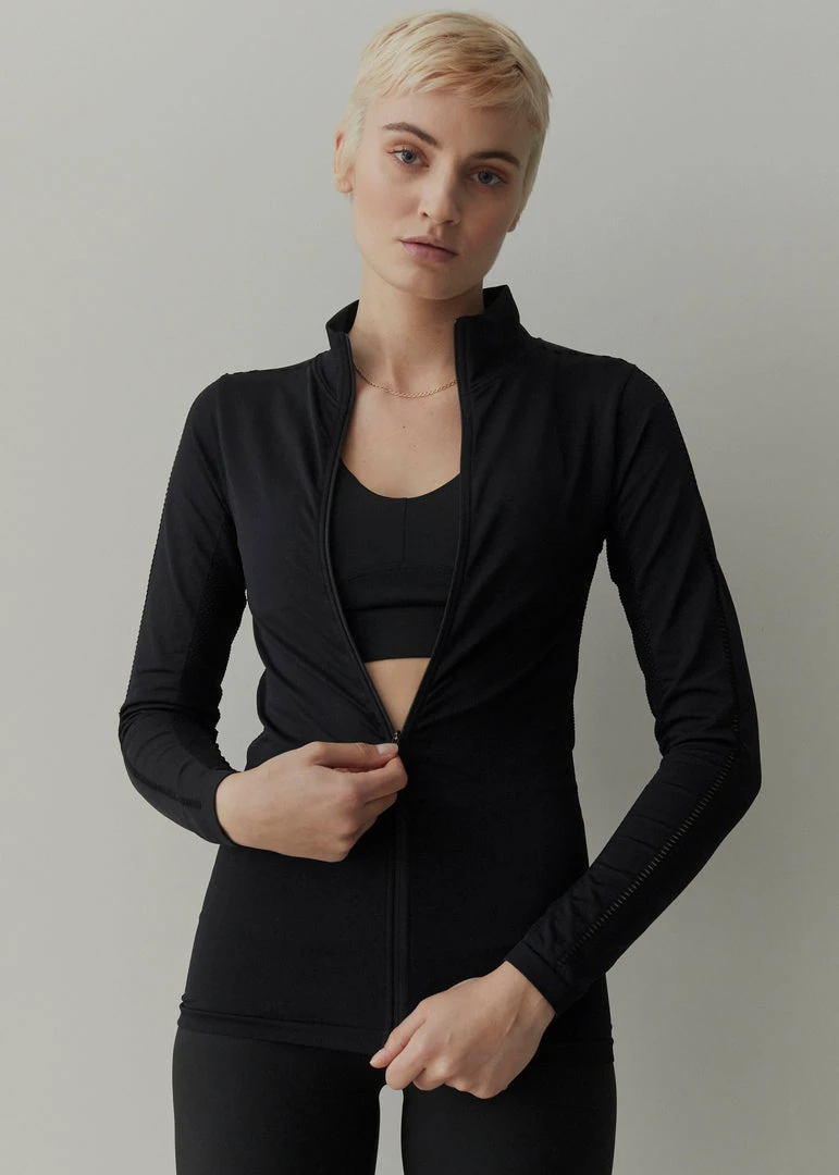 The Poinsetta Jacket is the perfect lightweight jacket to layer for higher intensity workouts. This Seamless Jacket features perforated side and back mesh panels allowing for airflow and a sleek stylish look. Great for your outdoor run or just throwing over your sports bra after a studio class.